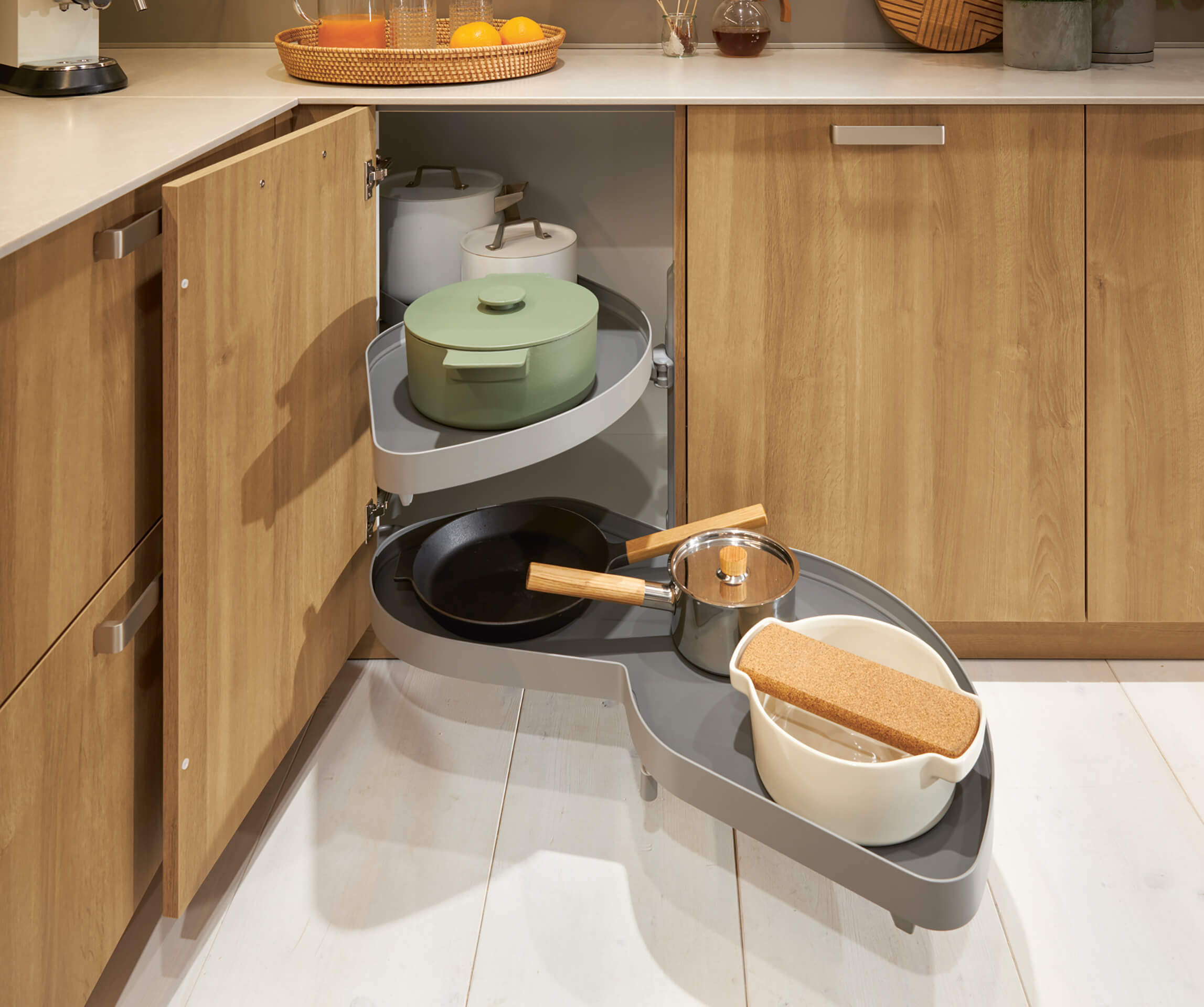 - Etažni izvlačni elemenat LeMans koji u potpunosti iskorištava ugao kuhinje, pruza visoku funkcionalnost za odlaganje vecih posuda, koje su sad lako dostupne.