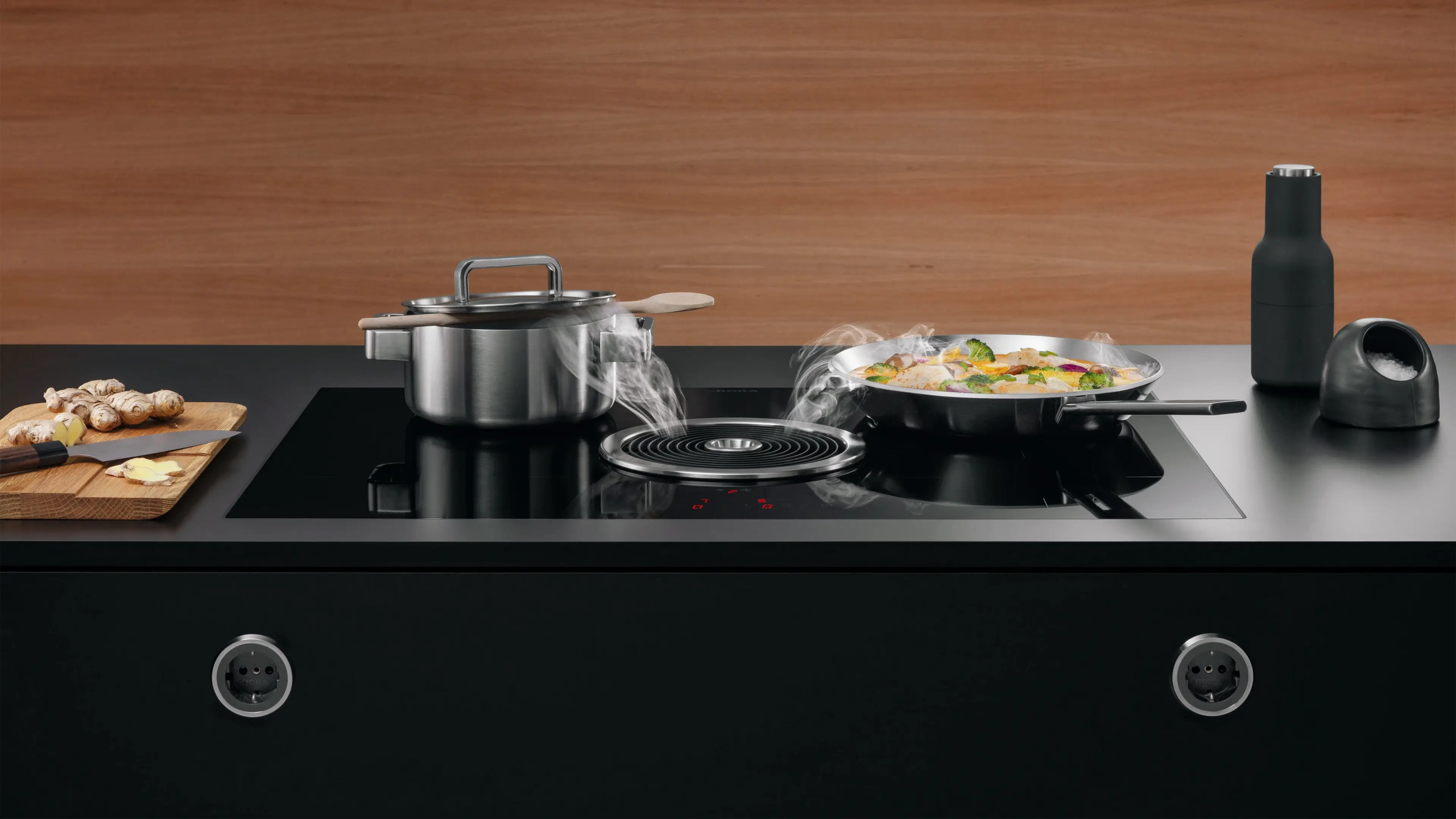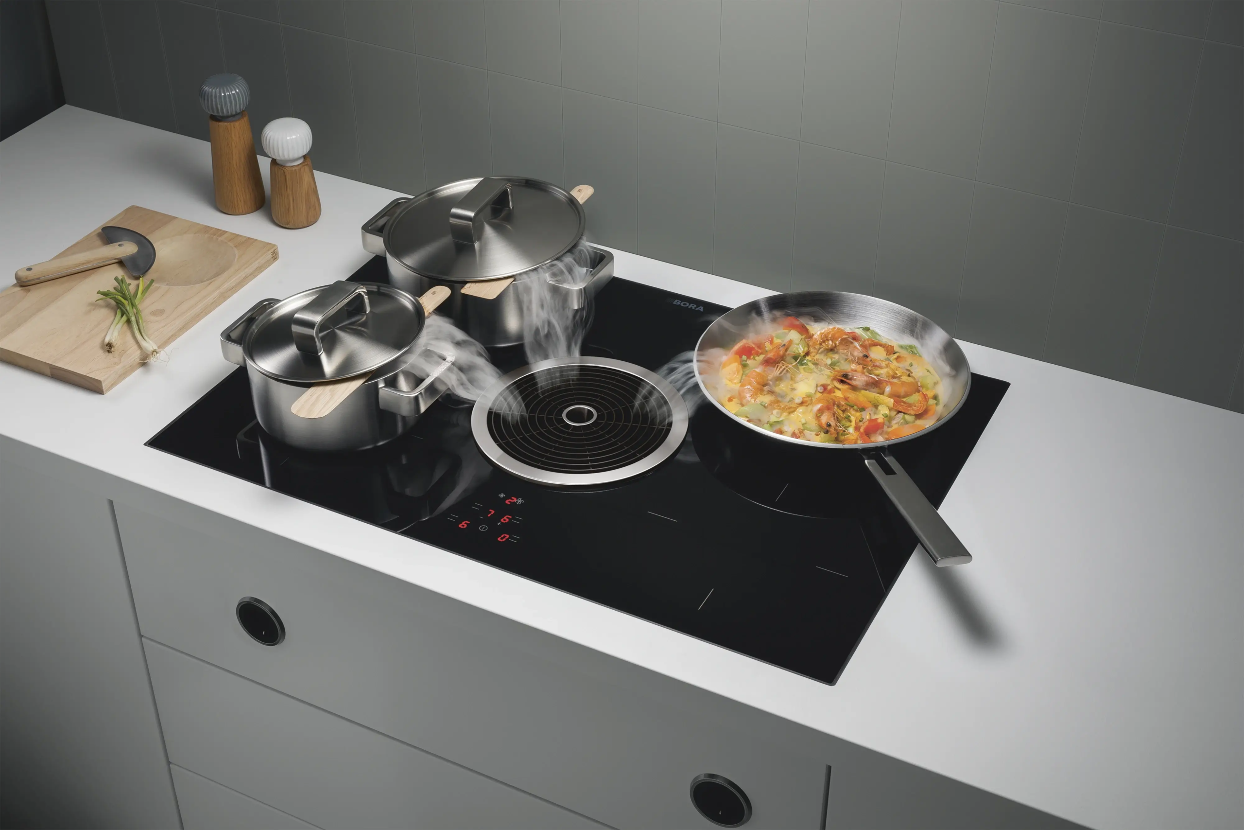 BORA Basic je inovativni uređaj koji se sastoji od visoko efikasne ploče za kuvanje i efikasnog aspiratora. Ključne karakteristike uključuju zonu za kuvanje sa grejnim elementima koji omogućavaju povećanje performansi do 50 procenata pri korišćenju podešavanja snage. Sofisticirana tehnologija, brza instalacija Zahvaljujući centralnoj kontrolnoj tabli i optimalnom rasporedu zona za kuvanje, korisnici mogu istovremeno da kuvaju sa do 4 velika lonca prečnika do 24 centimetra. Sistem takođe nudi praktične funkcije podešavanja zadržavanja toplote, koje održavaju temperaturu na konstantnom nivou od oko 75 °C, i funkciju zaštite za decu, koja sprečava slučajno ili neovlašćeno uključivanje ploče za kuvanje.